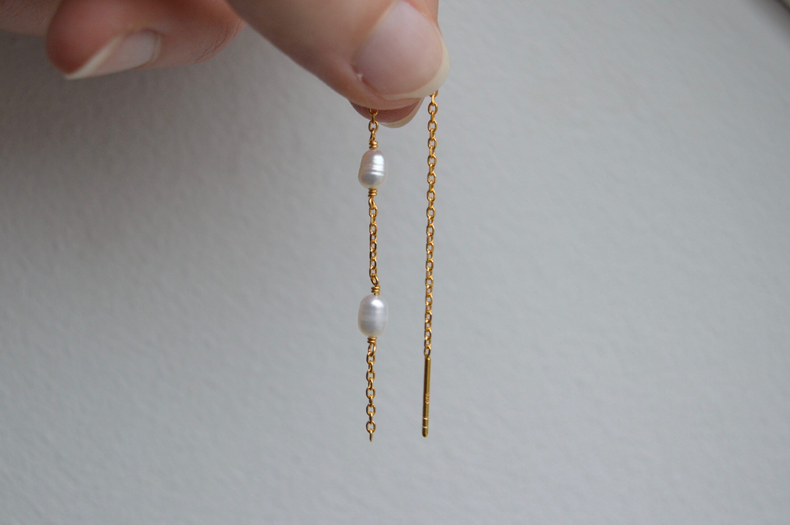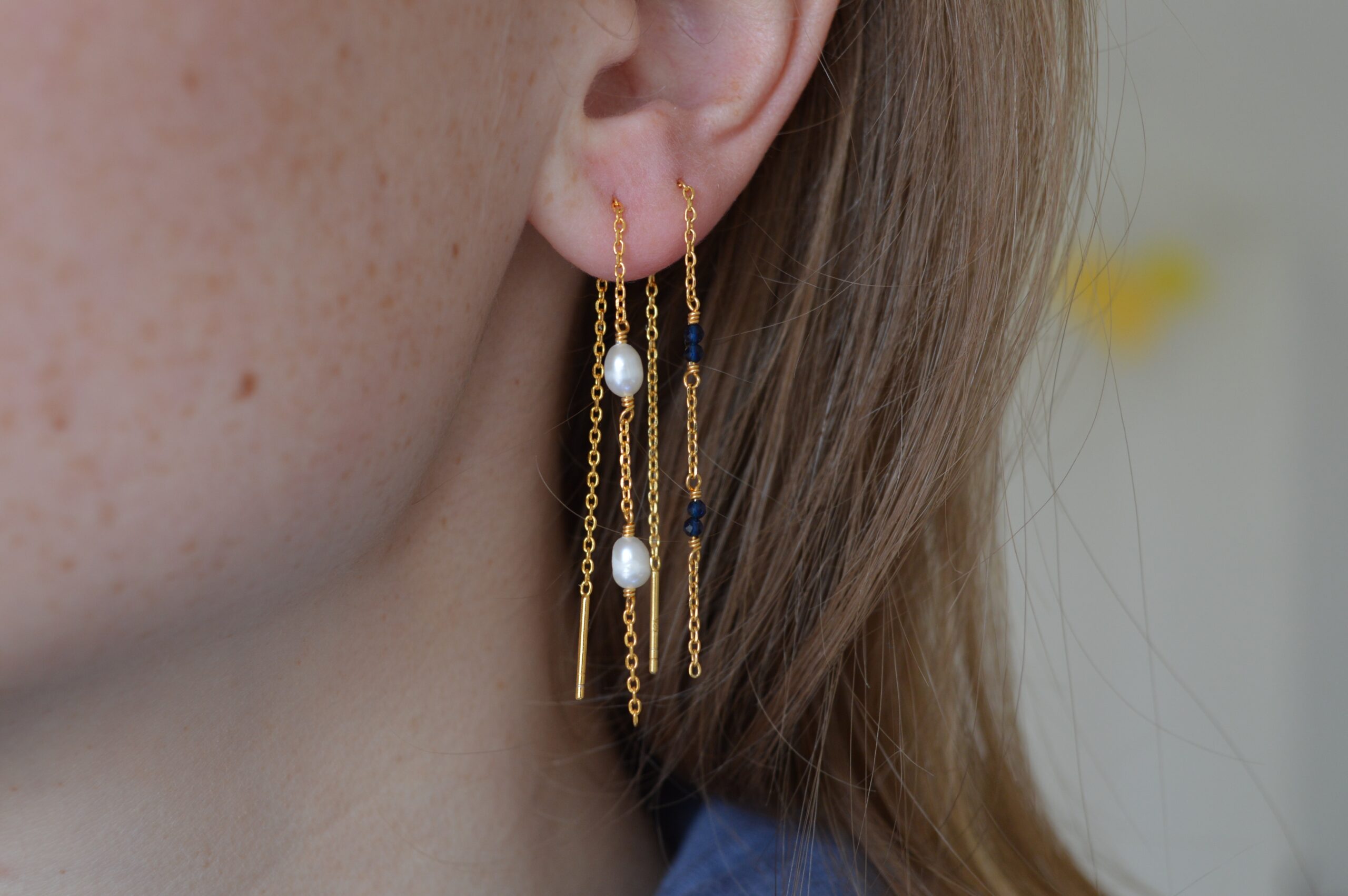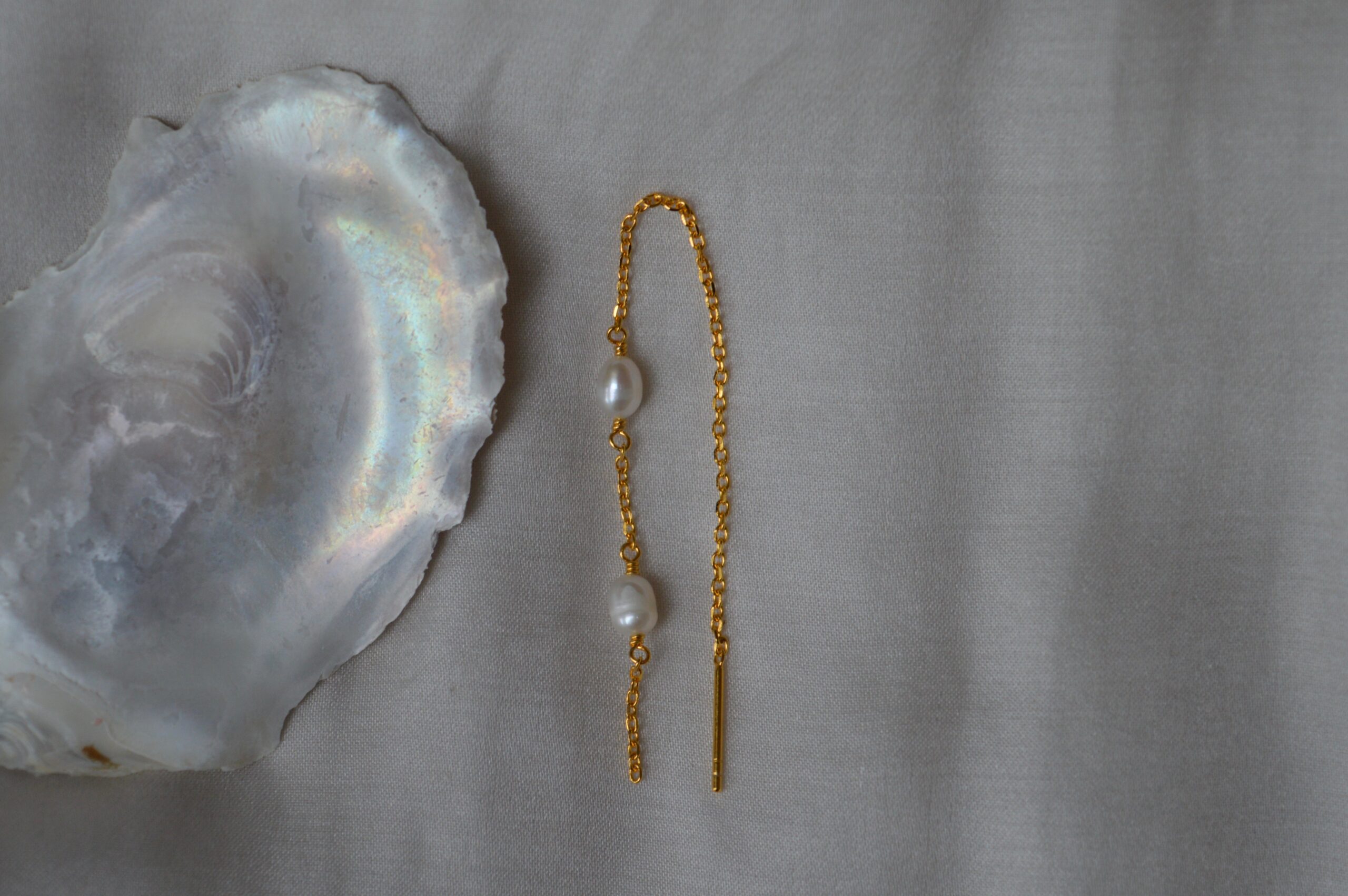 BAZZI er en ørekæde af sterling sølv 925, forgyldt med 22 karat guld. To ferskvandsperler med lidt mellemrum udgøre en mere simpel version af øreringen BALOU, og disse to kan fint gå sammen, hvis man har ekstra huller i ørerne.