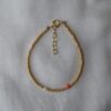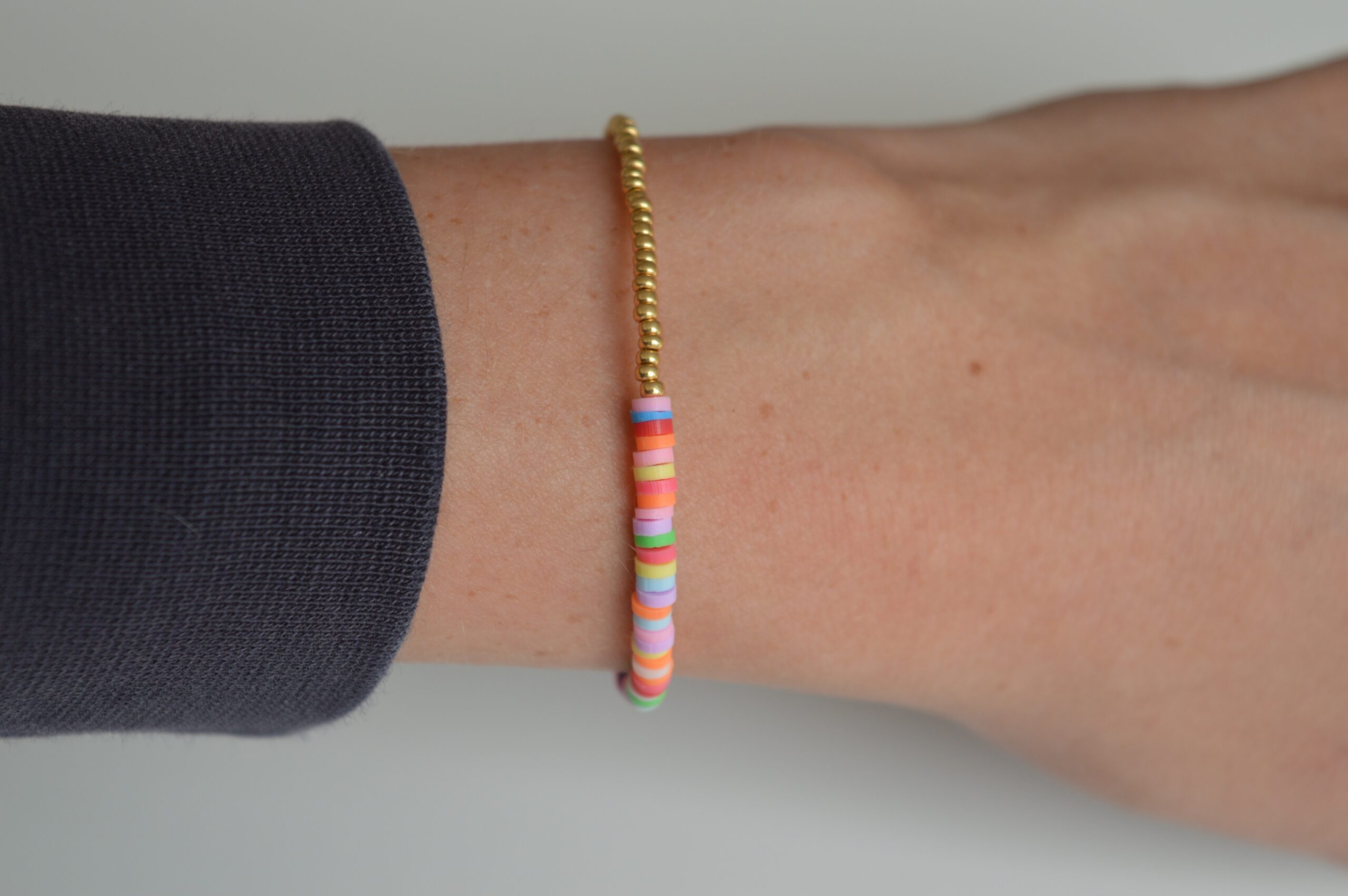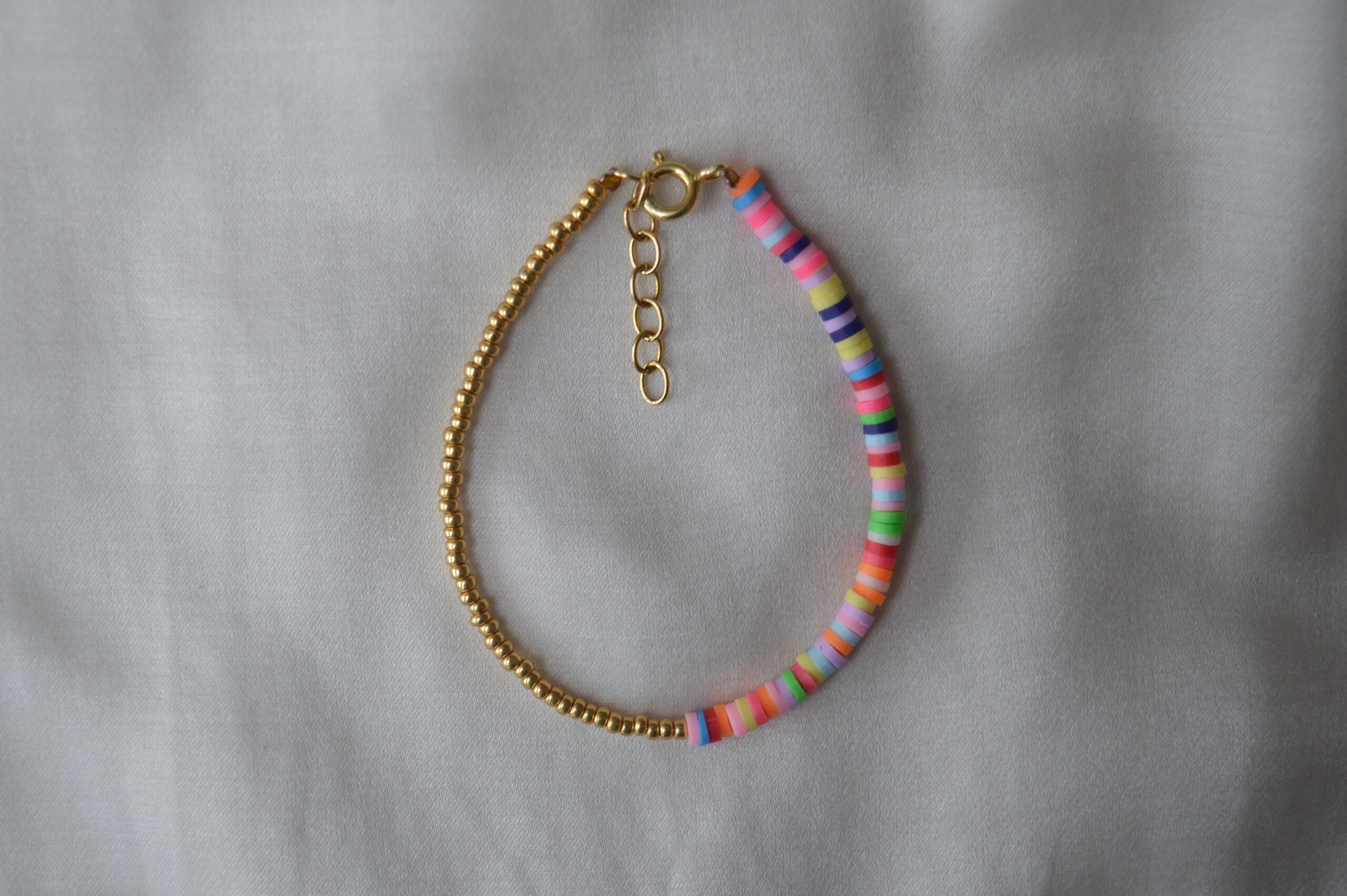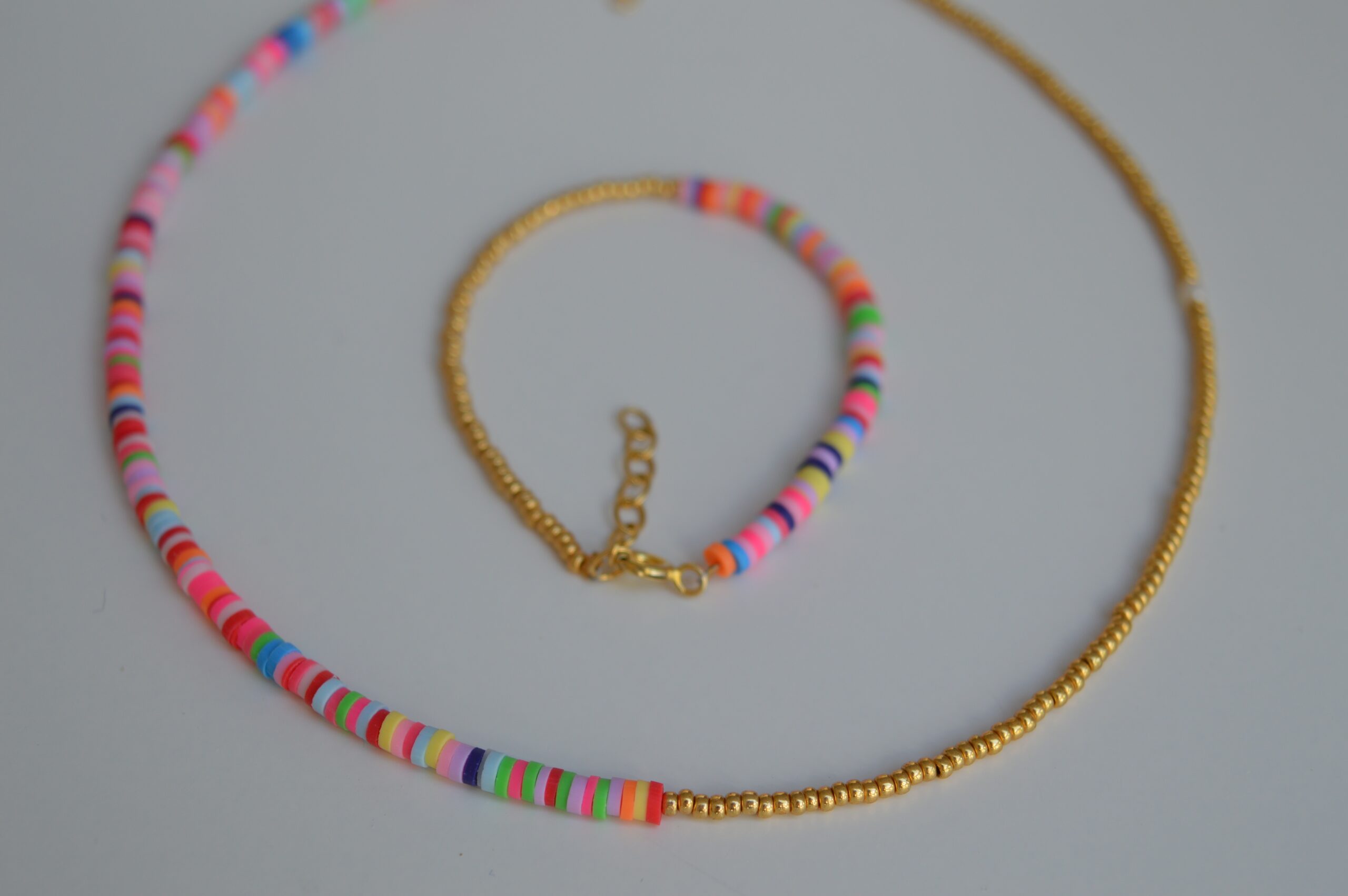 XENIA er det matchende armbånd til halskæden AURORA. Sættet er lavet af seed beads belagt med 22 Karat guld og af fimo perler, som er de mange farvede runde perler.